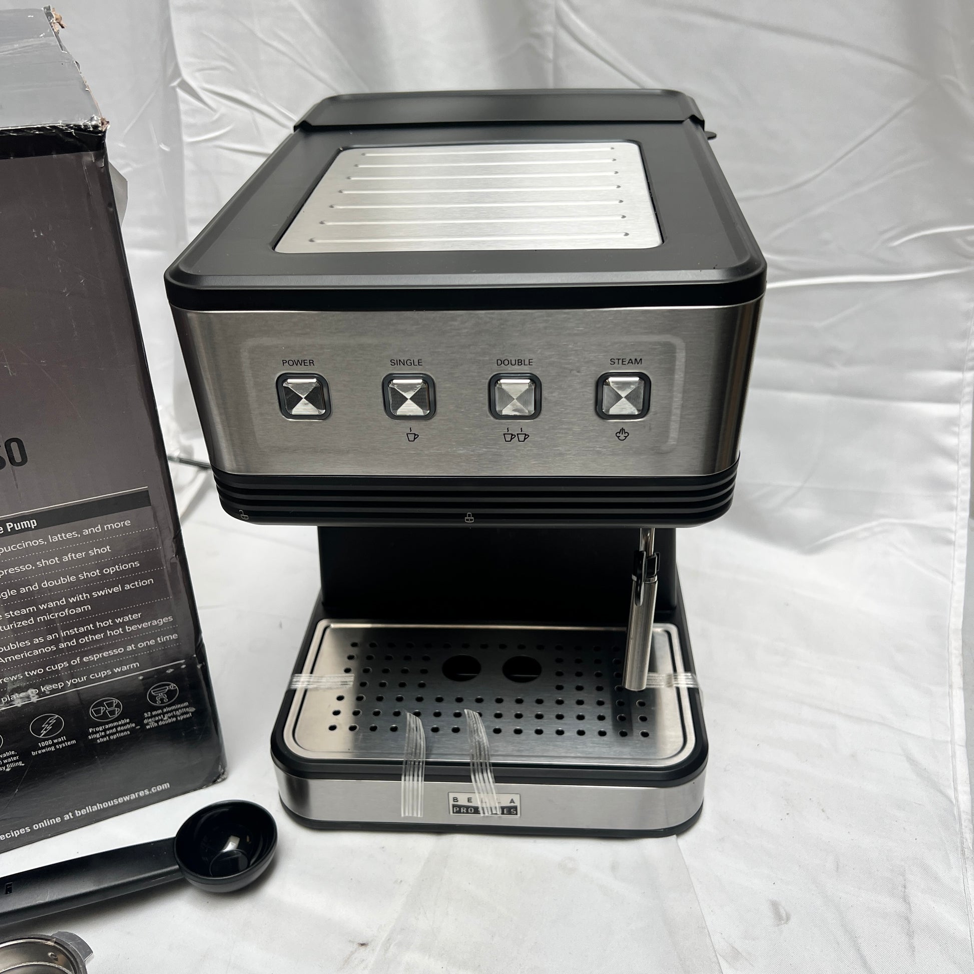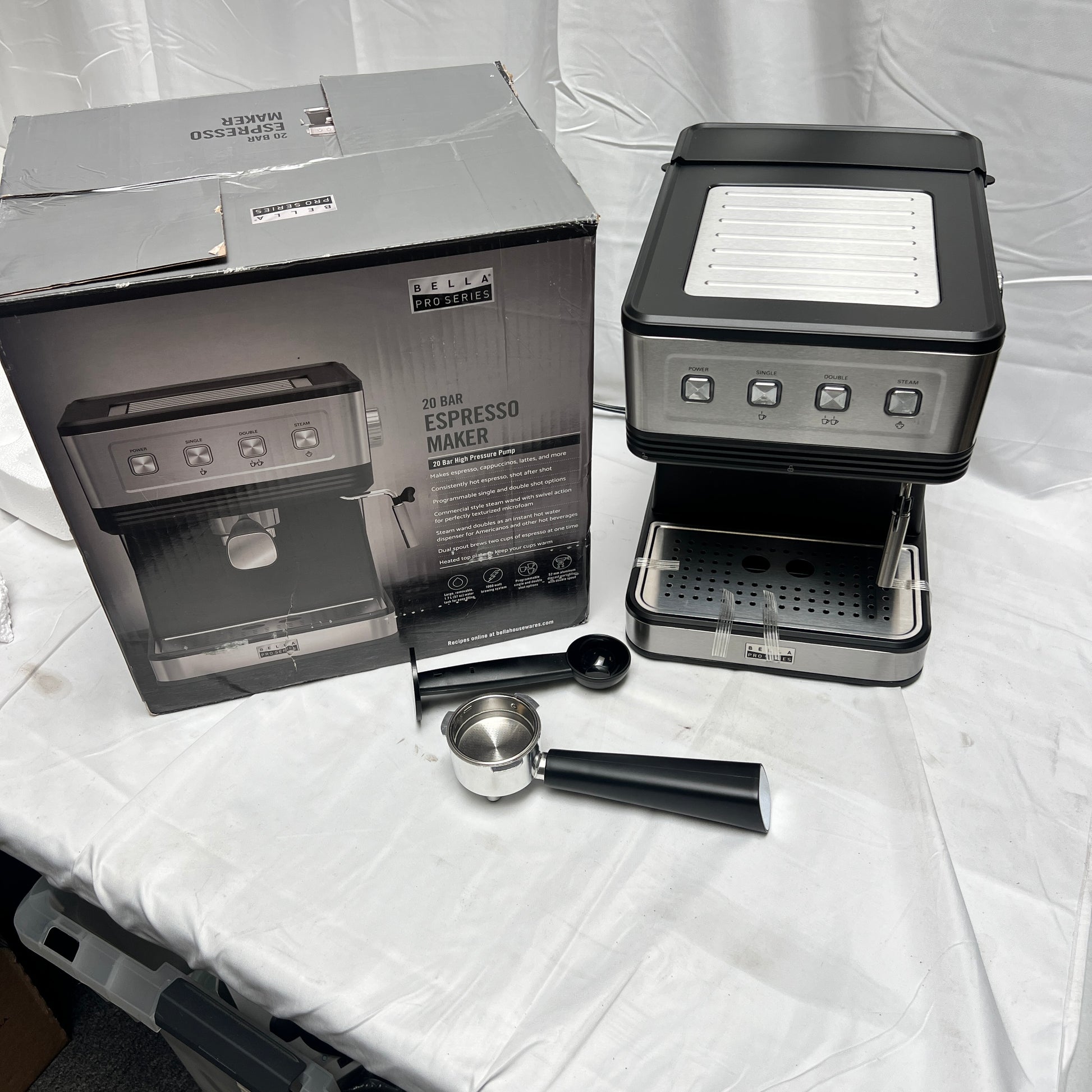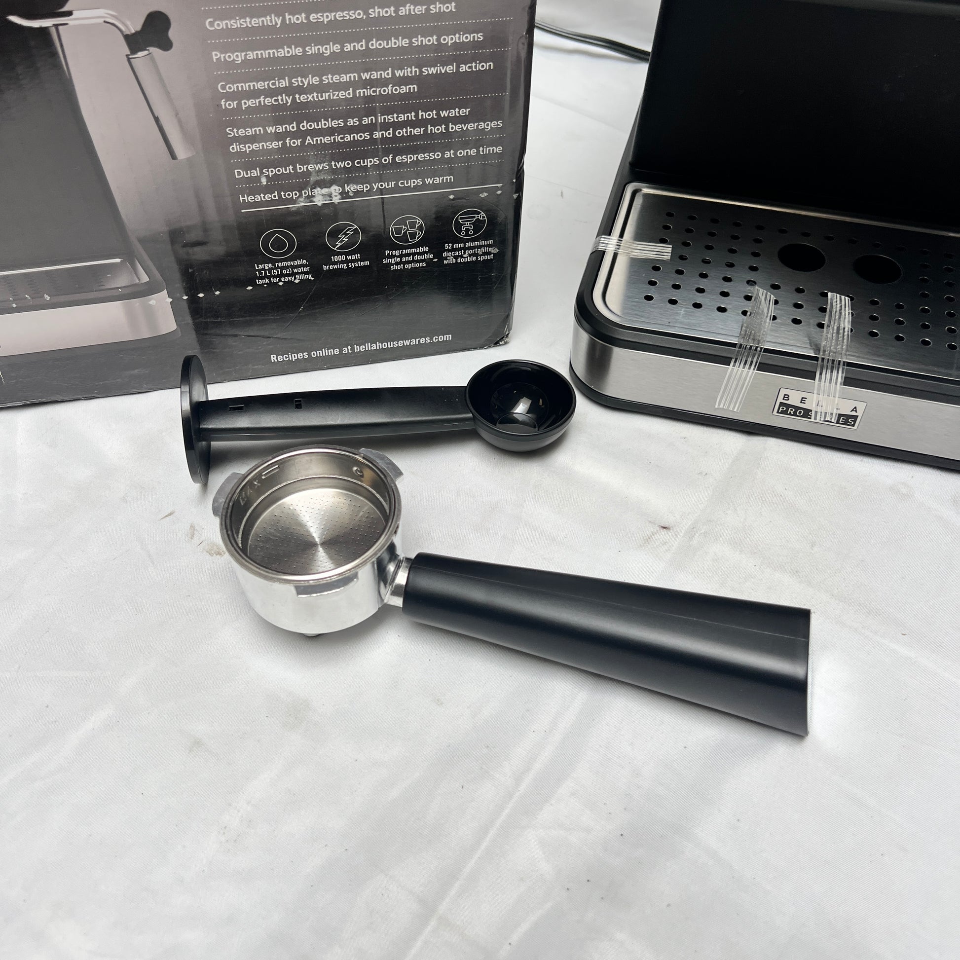 - Includes: Original box, Espresso maker, Portafilter, Filter cups and Tamper