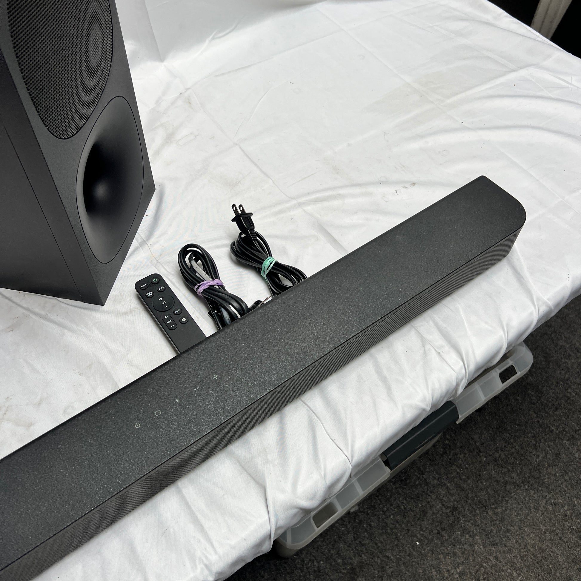 - Includes: Soundbar, Subwoofer, remote and power cables